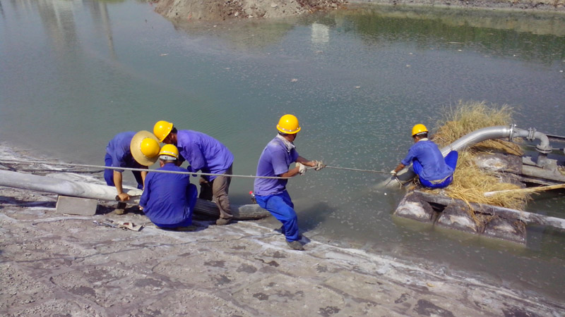 為配合磷石膏堆場南部淋溶水環境整治項目的施工,8月11日上午,z6mg人生就是博化工公司供水車間維修班員工頂著烈日、耐住高溫,順利完成了淋溶水泵一段近五十米管道的遷移工作。圖為供水車間人員正在進行淋溶水管道的連接工作。