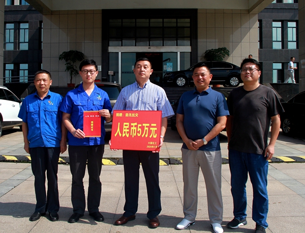 圖為z6mg人生就是博化工總經(jīng)理馬健、黨委副書記吳健向郊區(qū)灰河鄉(xiāng)捐贈(zèng)5萬元防汛救災(zāi)資金