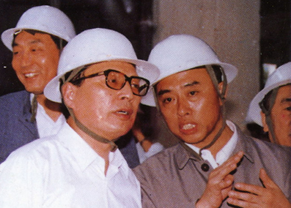 1988年5月16日,中共中央政治局常委、紀委書記喬石(左一)在省委書記、省長盧榮景的陪同下,蒞臨公司視察。